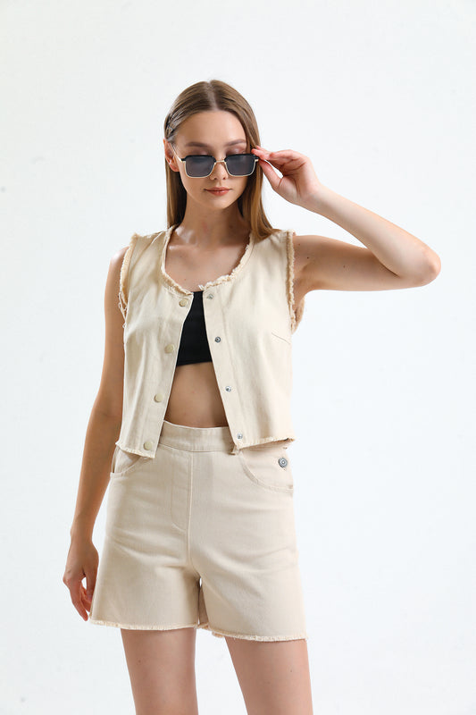 Cute Ceket Şortlu Jean Takım Krem